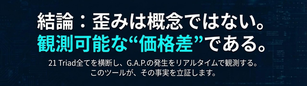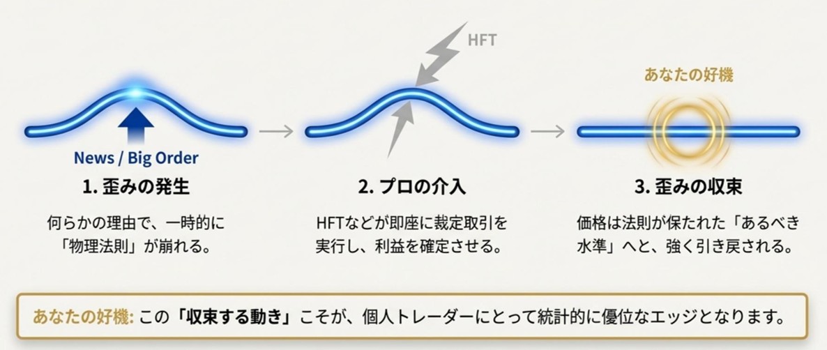 前回までの記事では、FX市場に存在する「三角通貨パリティ(Triangular Parity)」という“相場の物理法則”と、その法則が崩れた瞬間に生じる歪み(Distortion)を、裁定ロジックと統計的な視点で読み解いてきました。