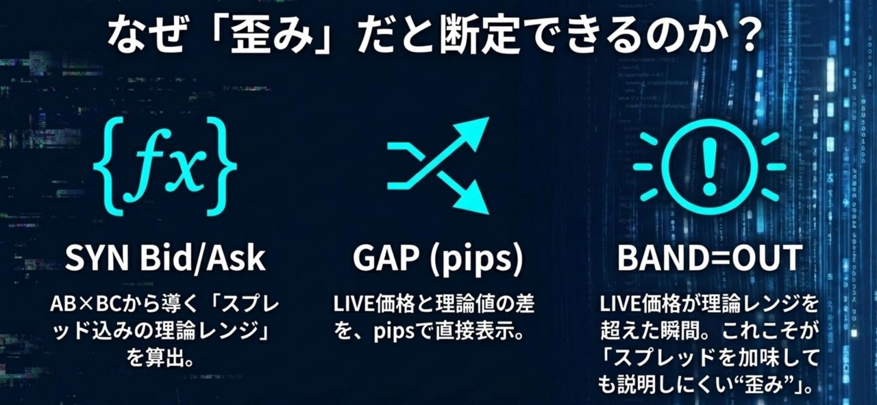 LiveGAPでは、理論値を単なるMid比較ではなく、SYN Bid/Ask(スプレッド込み理論レンジ)として計算します。
