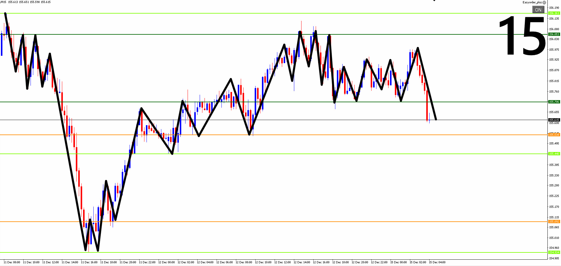●日足・4時間足・1時間足・15分足までの相場を水平線と波動(ダウ理論)を使って環境認識し、勝率の高いエントリーポイントを3つに絞る