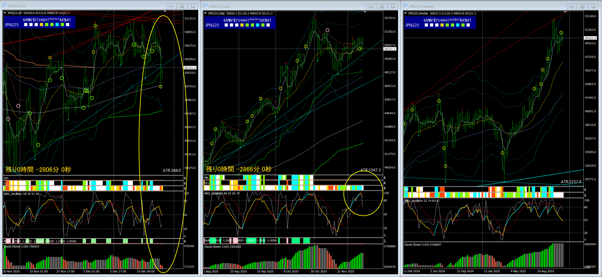 一方で、週足のMAXオシレーター、シンクロバンドは「中立」を示唆