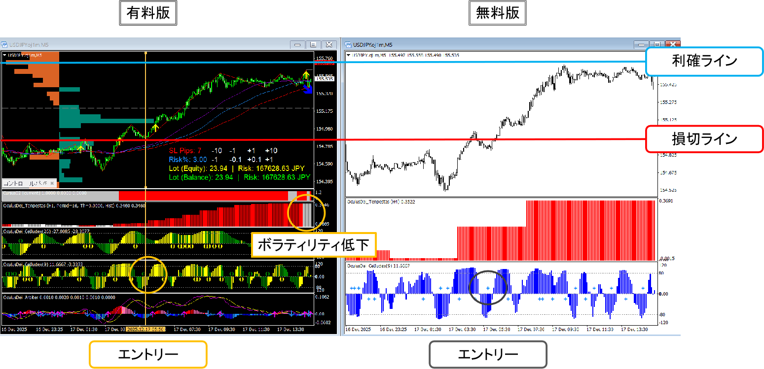 エントリーで示した部分では、ボラティリティを示唆する赤いヒストグラム(Tempestas 有料版、無料版)がすでに上昇を開始しています。トレンド状況はレンジ部分を上抜けし、売買方向は買いを示唆しています(Cursus02 有料版)。