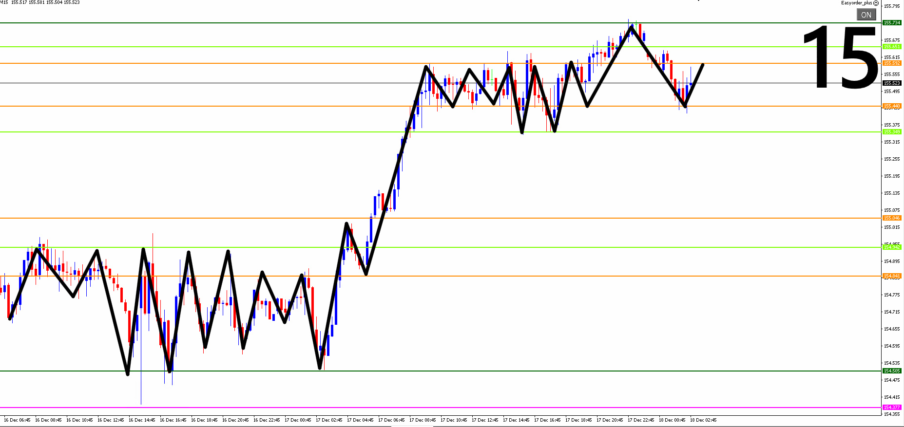 ●日足・4時間足・1時間足・15分足までの相場を水平線と波動(ダウ理論)を使って環境認識し、勝率の高いエントリーポイントを3つに絞る