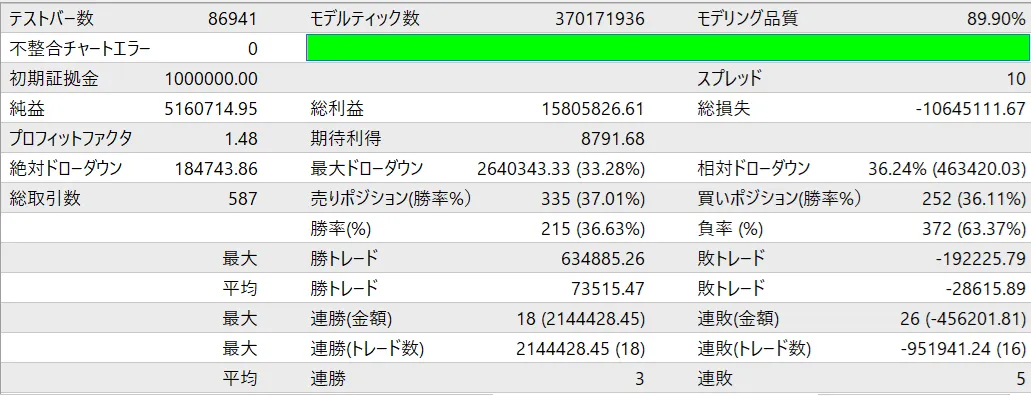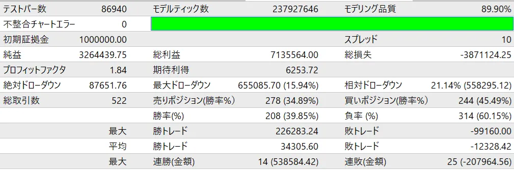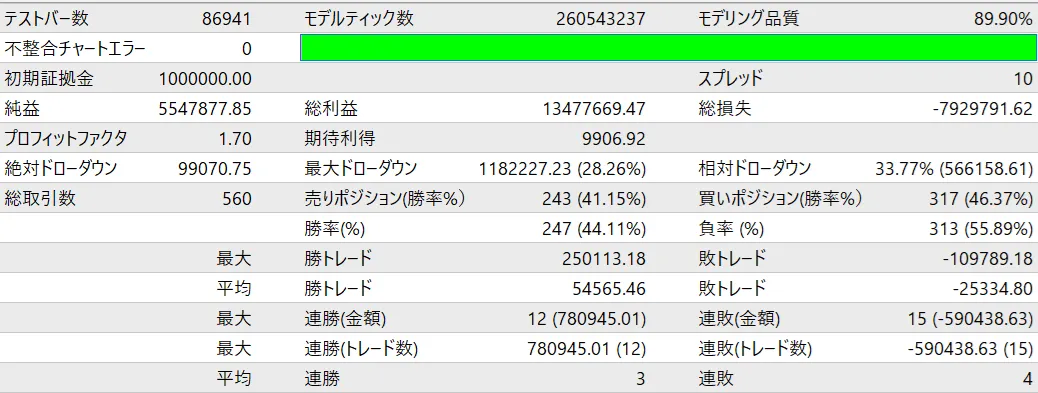 共通設定 ロット数設定:単利0.3LOT(3万通貨)スプレッド:10 初期証拠金:100万円 consecutiveEntryLimit(連続エントリー制限):オフ |