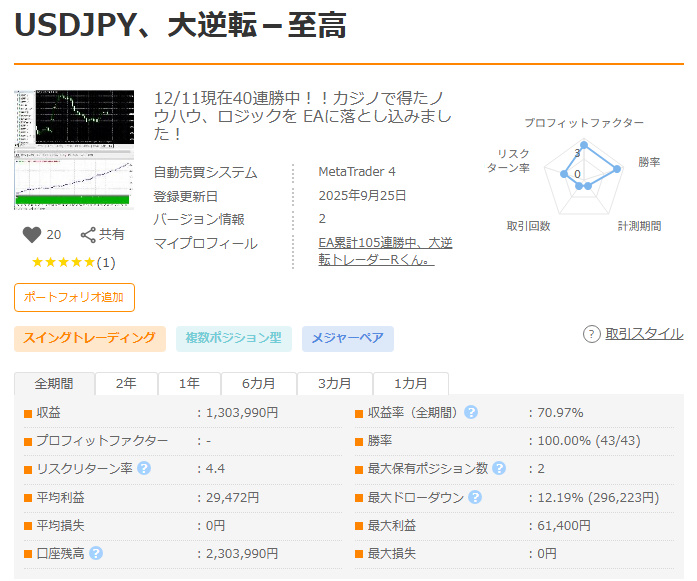 USDJPY、大逆転-至高 - システムトレード - 世界のトレード手法・ツールが集まるマーケットプレイス - GogoJungle