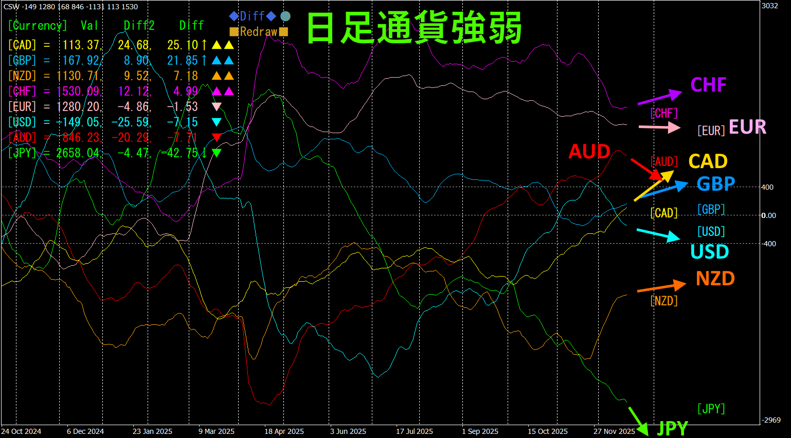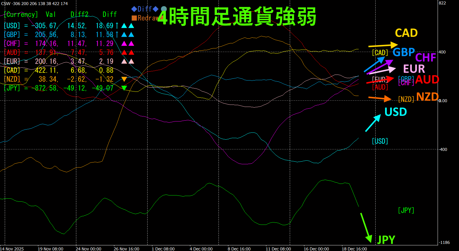 4時間足では、USD、GBP、CHF、AUD、EUR、CADが上向きに、JPY、NZDが下向きになっています。