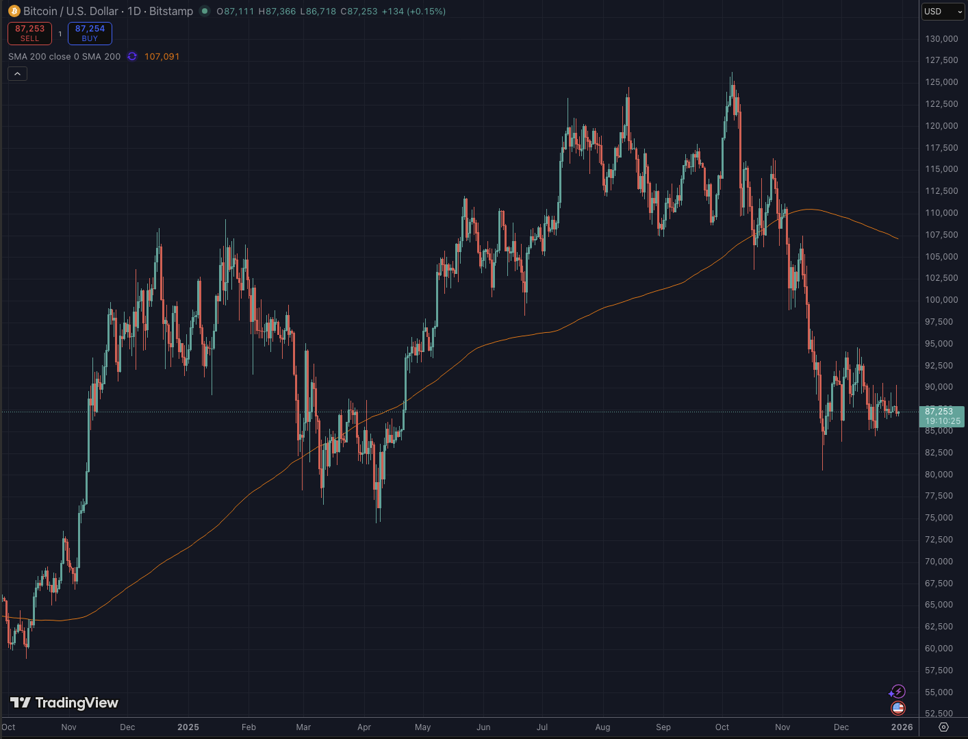 ビットコインのチャートを詳細に分析すると、11月下旬からの下落局面を経て反発したものの、現在は8万7,000ドル付近の価格帯で「収束(持ち合い)」の状態にあります。
