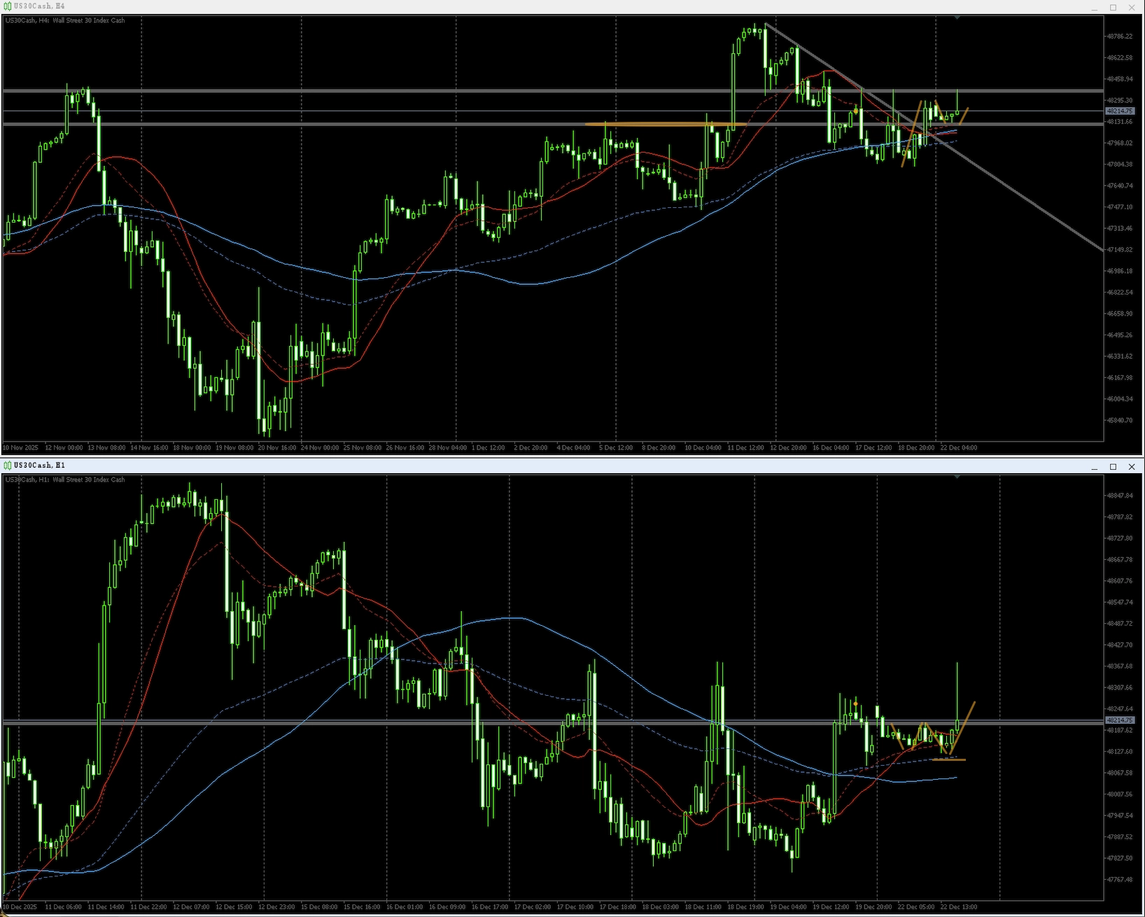 1h、MA収束中、下側白ラインは以前の戻り高値水準で、そこ上抜け後のサポレジ支え