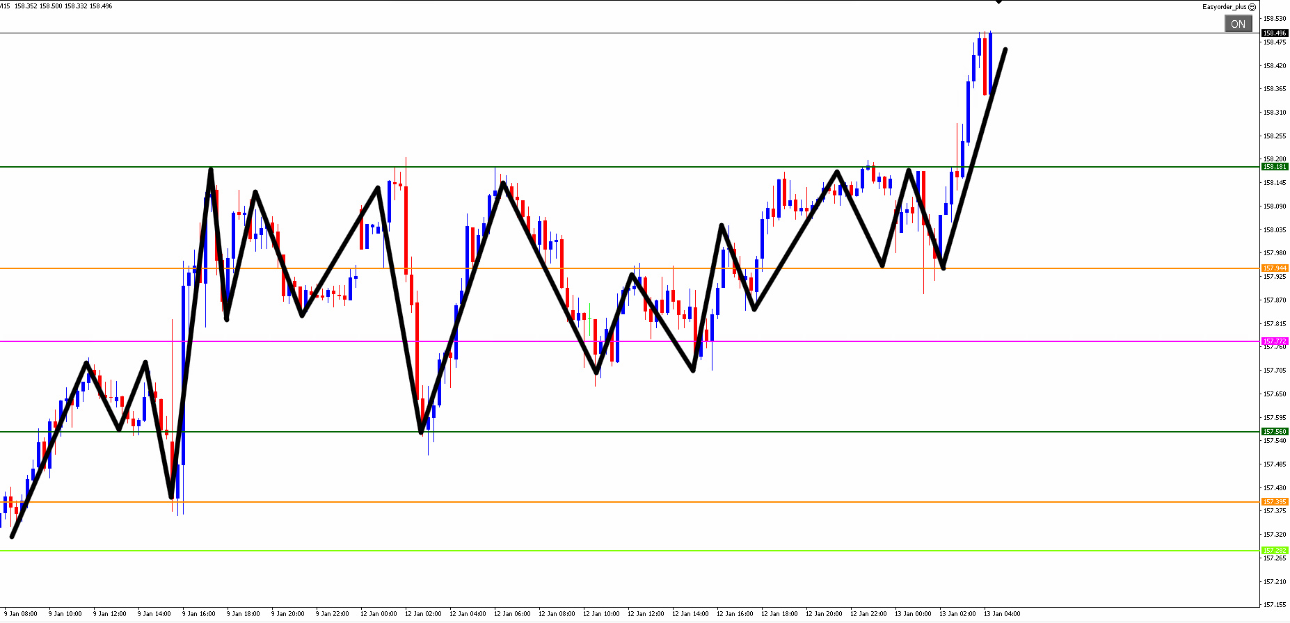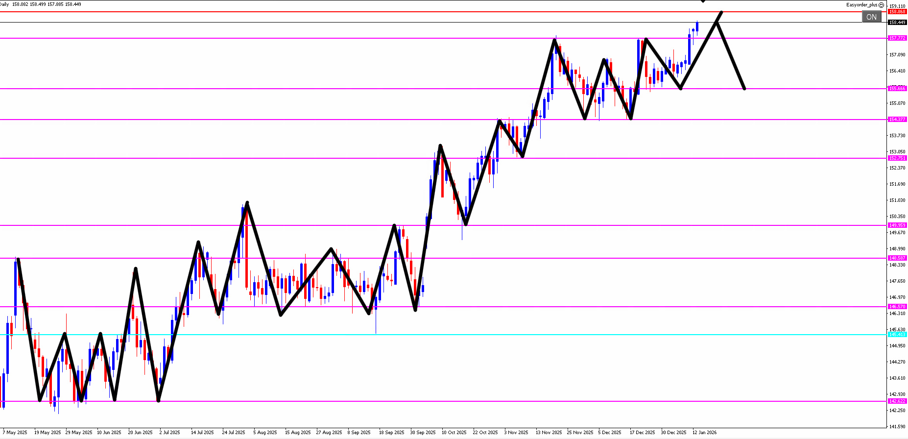 【赤丸①】158.500円をこえたあとの押し目買い。