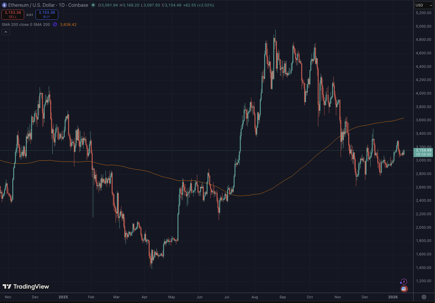 イーサリアム(ETH)は本日0.5%の下落となり、約3,100ドルで推移しています。週間ベースでも2.5%の下落を記録し、ビットコイン同様に軟調な展開となっています。