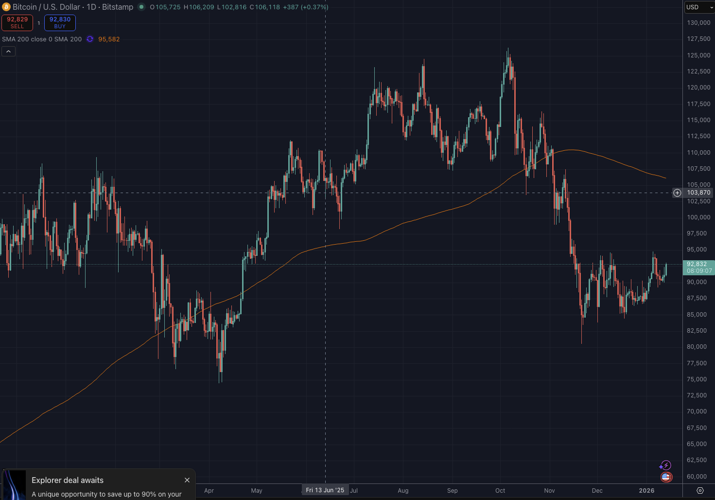 現時点において、ビットコイン(BTC)の価格は9万2,000ドル付近で取引されています。本日の騰落率はプラス1.1%前後とわずかな上昇を示していますが、週間ベースで見ると依然として約2.5%の下落となっており、直近の調整局面を完全には脱却できていない状況です。