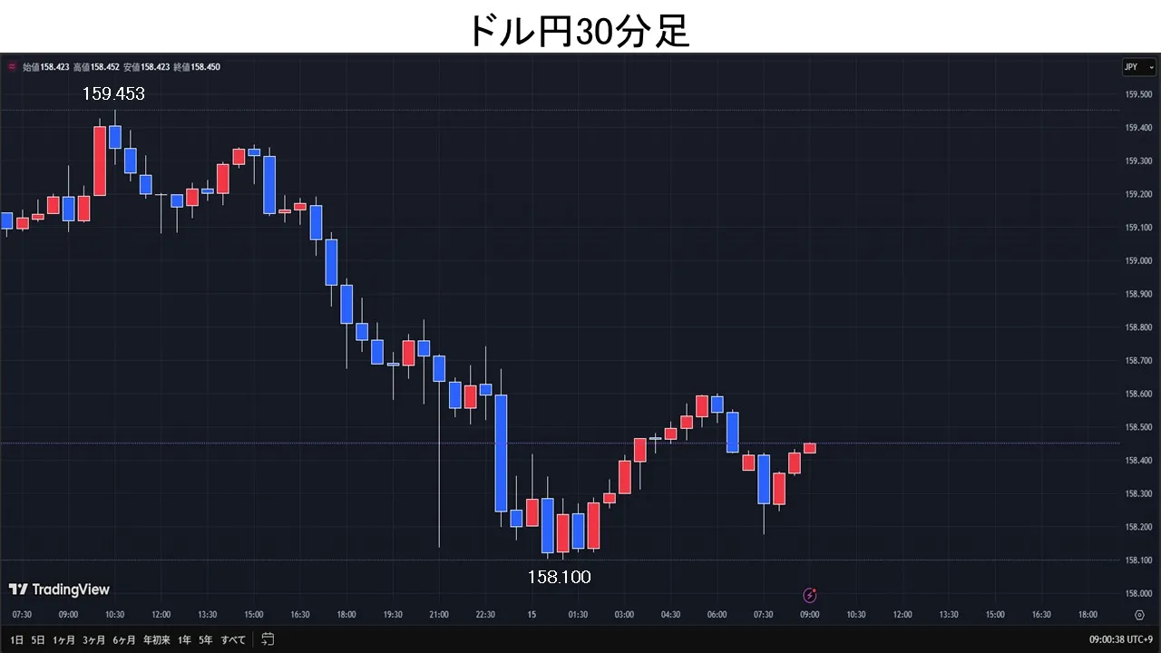東京時間、ドル円は、衆議院解散総選挙がほぼ確実視される中、日経平均の大幅高などを受け、前日高値159.19円を上抜けて159.45円まで上昇。欧州時間、片山財務相や三村淳財務官による円安けん制発言を受け、政府・日銀による為替介入への警戒感が広がり、円買い・ドル売りが先行。21時頃「立憲民主党と公明党は新党結成を視野に調整に入った」との一部報道が伝わり、日経平均先物の急落とともにドル円は一時158.19円まで下落。NY時間、ベッセント米財務長官が「韓国のウォン安はファンダメンタルズと整合しない」「為替市場の過度な変動は望ましくない」と述べるとドル安・ウォン高が先行。円買いが優勢になると、ドル円は、158.10円まで下落。その後、ドル円は引けにかけて158.60円まで買い戻された。