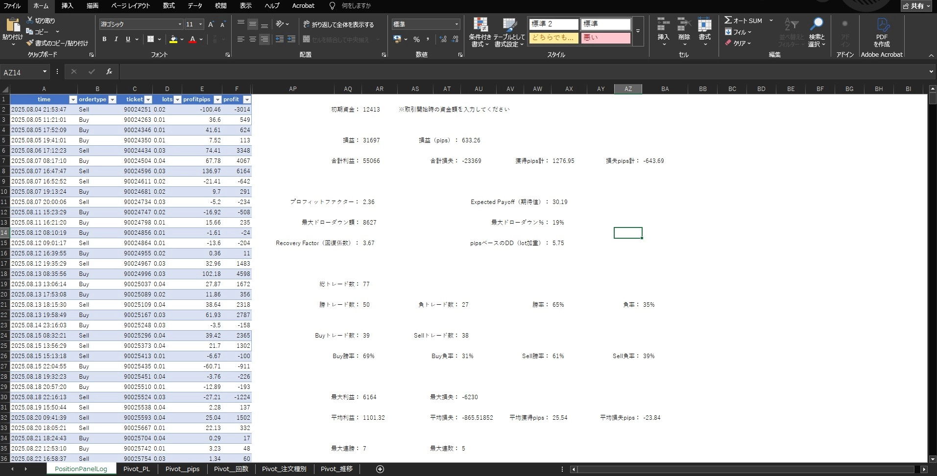 ★主な分析項目:「損益(pips含む)」「プロフィットファクター、期待値、ドローダウン、pips比重ドローダウン」「売買種別トレード数と勝率等」「最大、平均損益(pips含む)」「連勝記録、連勝最大額」