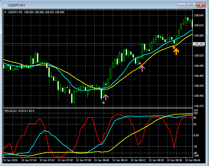 上のチャートでは、mBDSR(MA2本フィルター)とR1R2S2のサインがタイミングよく点灯している。