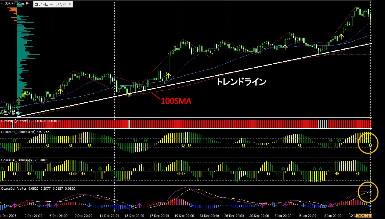 4時間足のCelJudex(26)の売りサイン、またはArbiterのデッドクロスを相場環境の目安とし