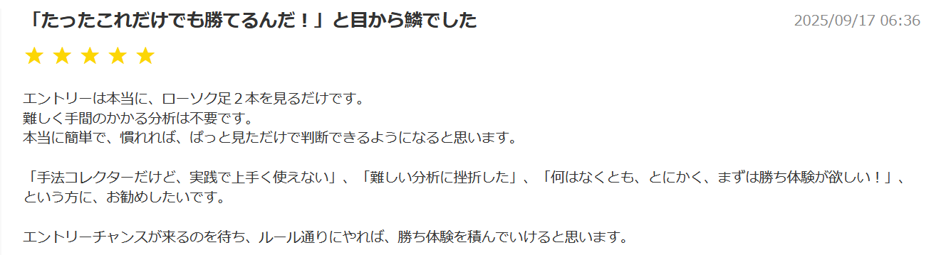 ローソク足のみで売買し、高勝率なトレードが可能になるものです。