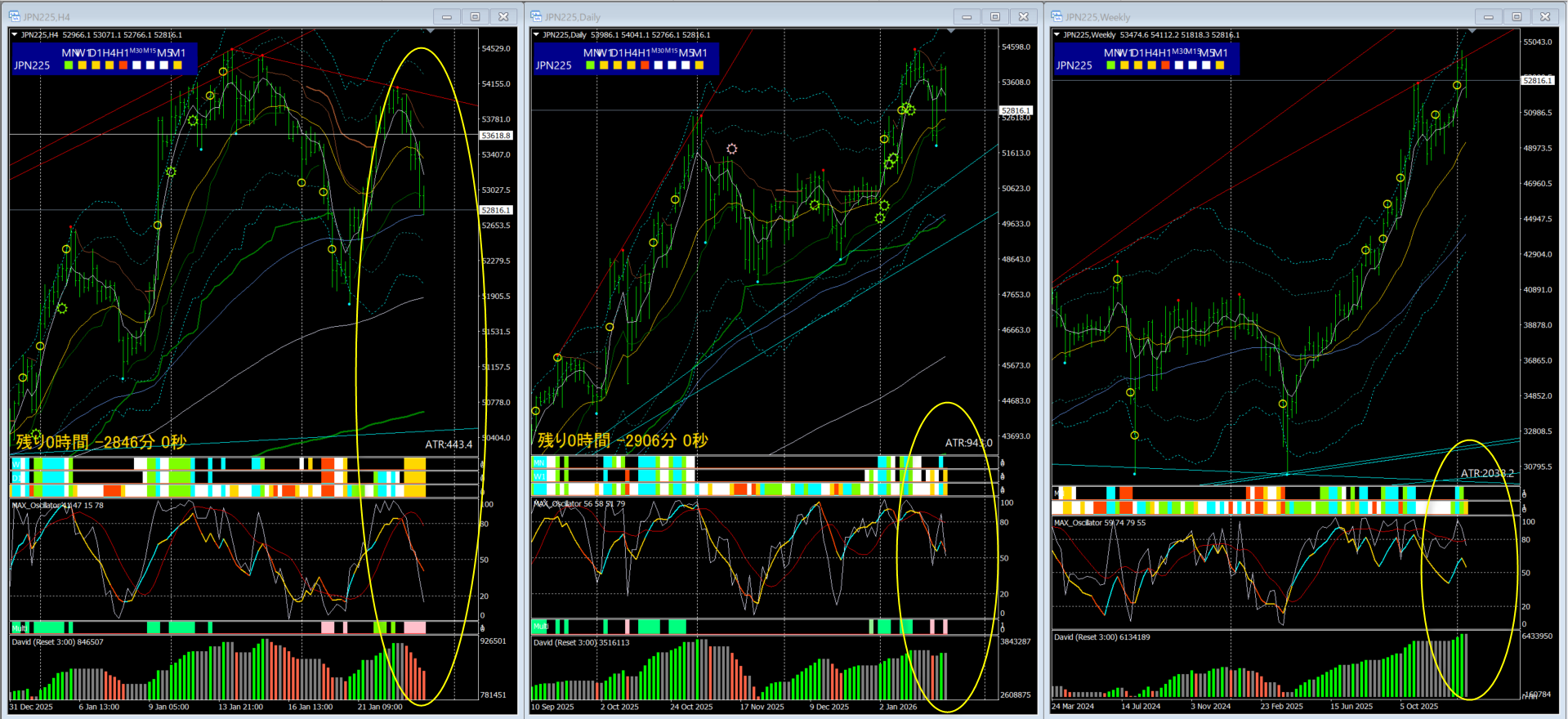 日足のMAXオシレーター・シンクロバンドは現在は「弱い下落」に変化