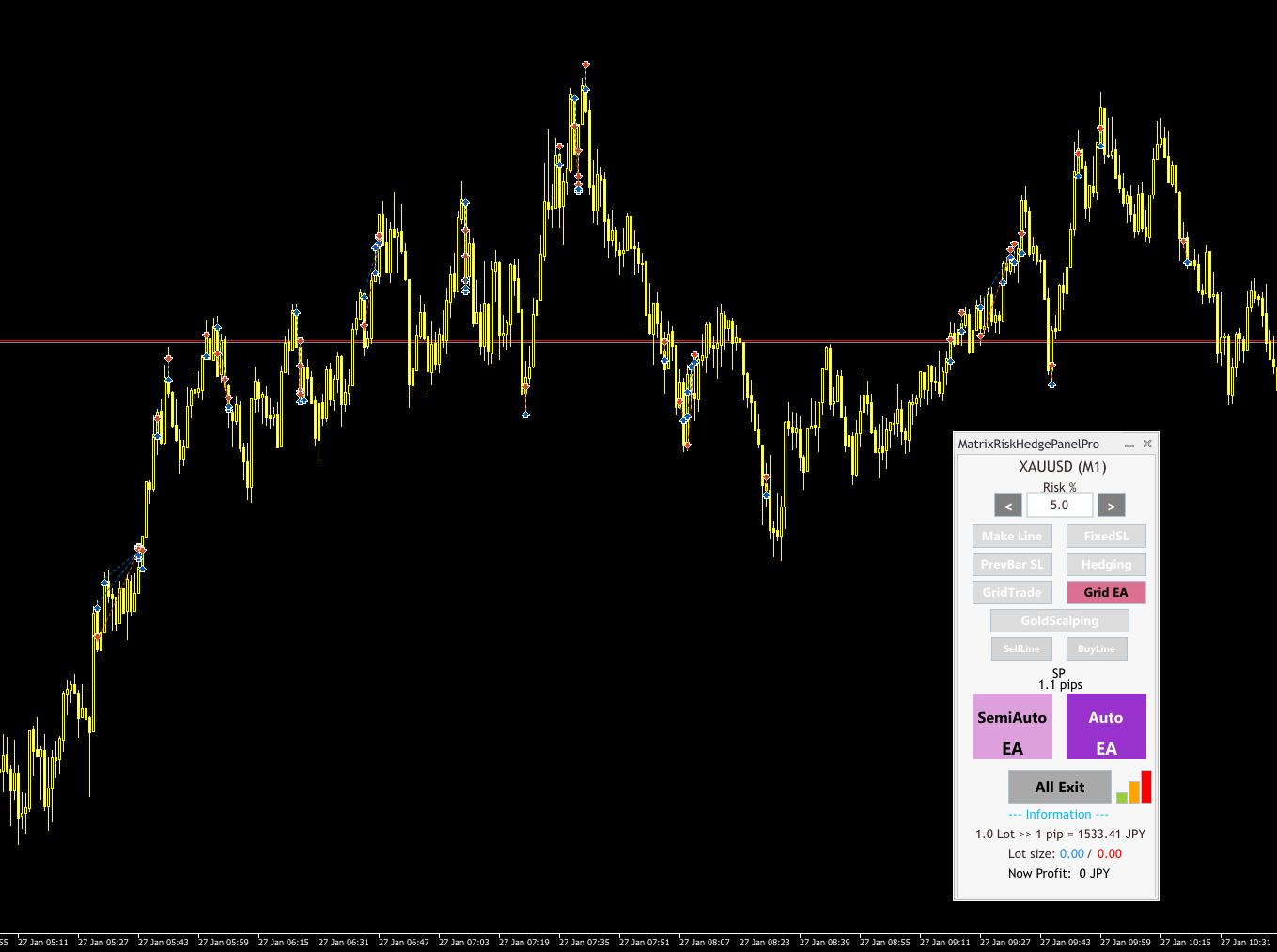 本日もEAを使った自動売買の結果をご報告します。今日も『MatrixRiskHedgePanelPro』を使って、ゴールド(XAUUSD)で2回のセッションを回してみました。