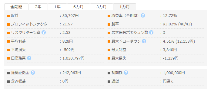 グラフをご覧の通り、大きな凹みを作ることなく右肩上がりで推移しています。AIが相場環境を適切に判断し、無駄なエントリーを控つつ、勝てるポイントを的確に狙えている証拠です。