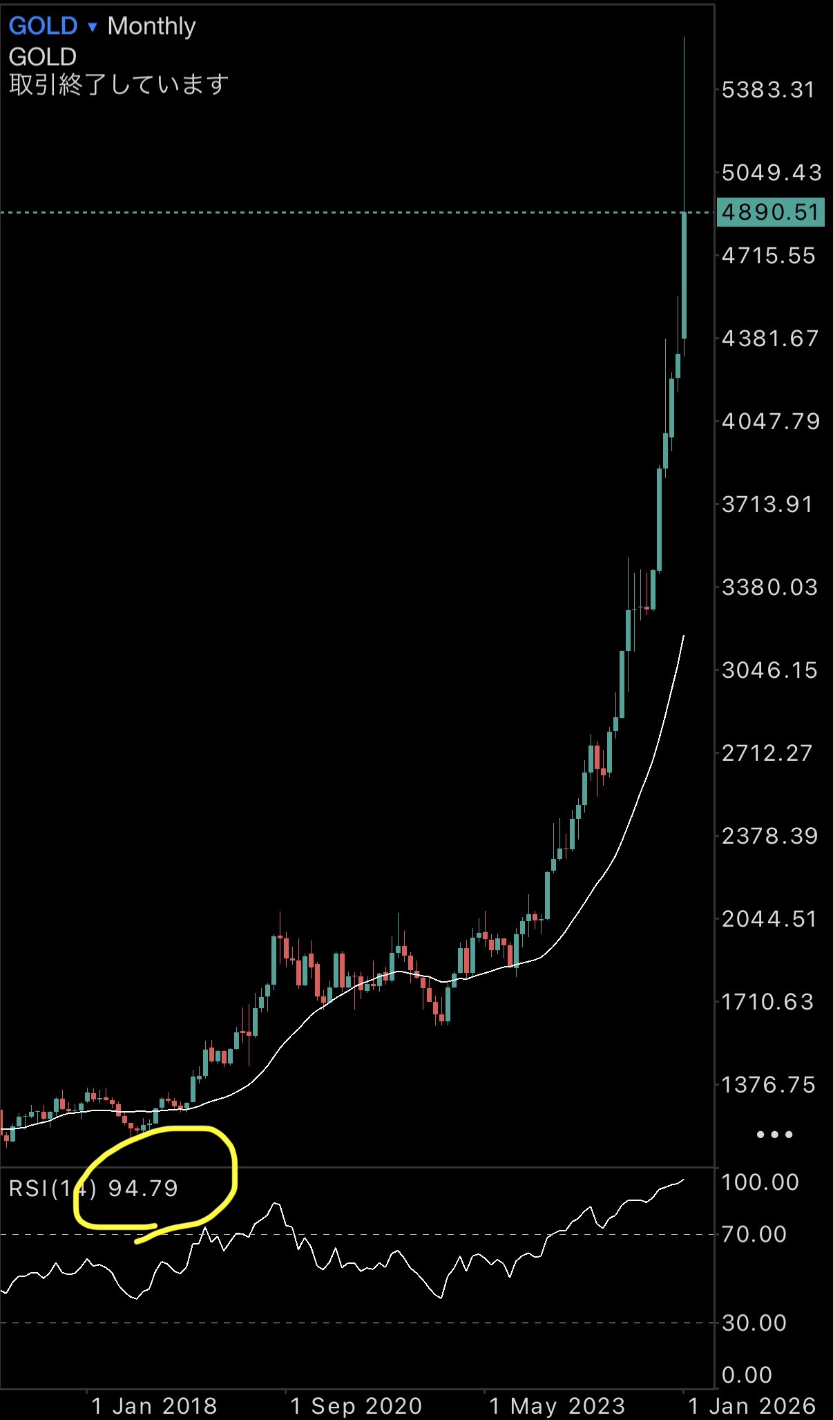 月足でRSIが90を超えるという、正直これまでのトレード人生で一度も見たことがない水準まで買われていました。