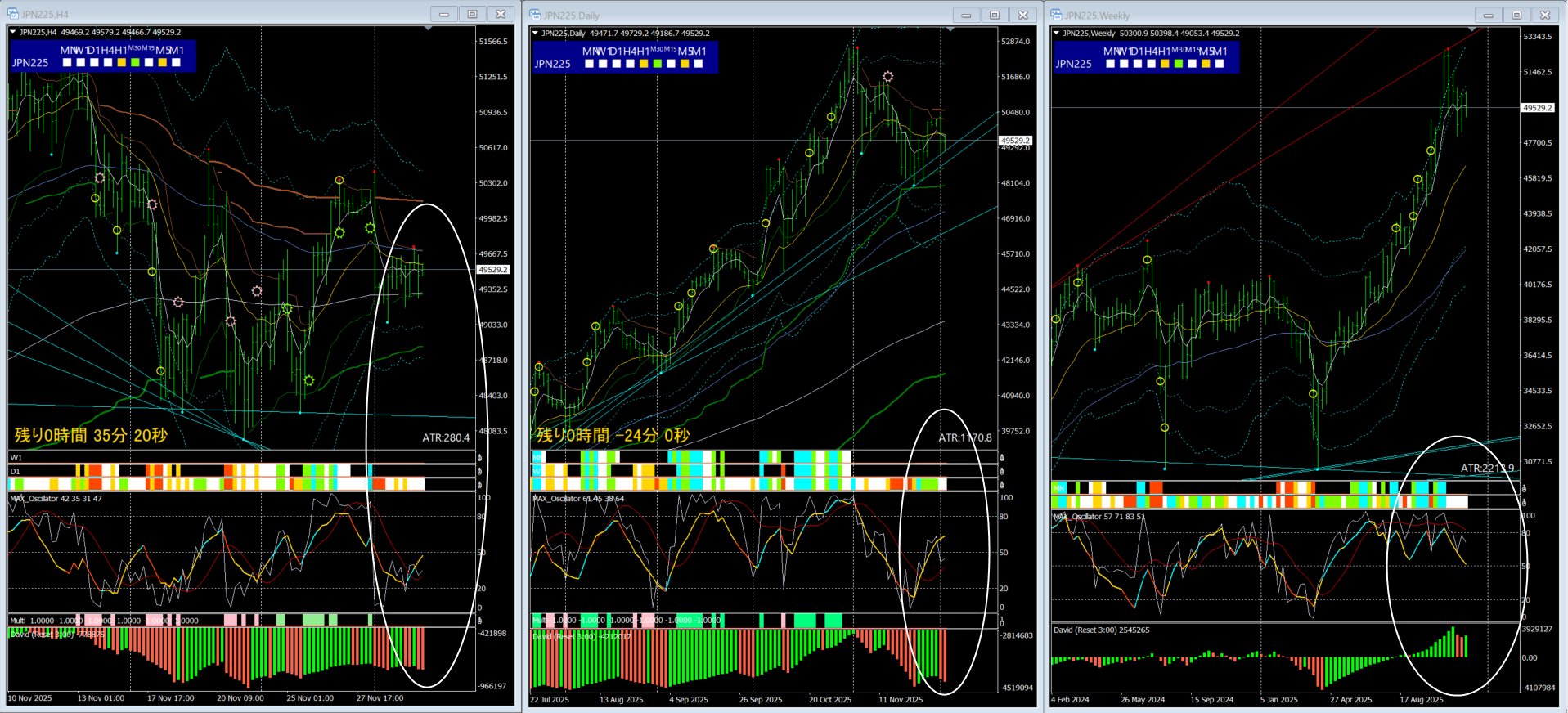 一方で、週足のMAXオシレーター、シンクロバンドは「中立」を示唆