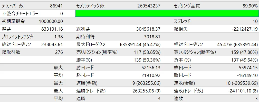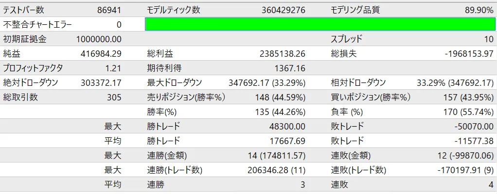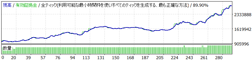 共通設定 ☆複利に設定した場合 ロット数設定:基準0.2LOT 残高100万毎に+0.1LOT スプレッド:10 初期証拠金:100万円 consecutiveEntryLimit(連続エントリー制限):オフ |