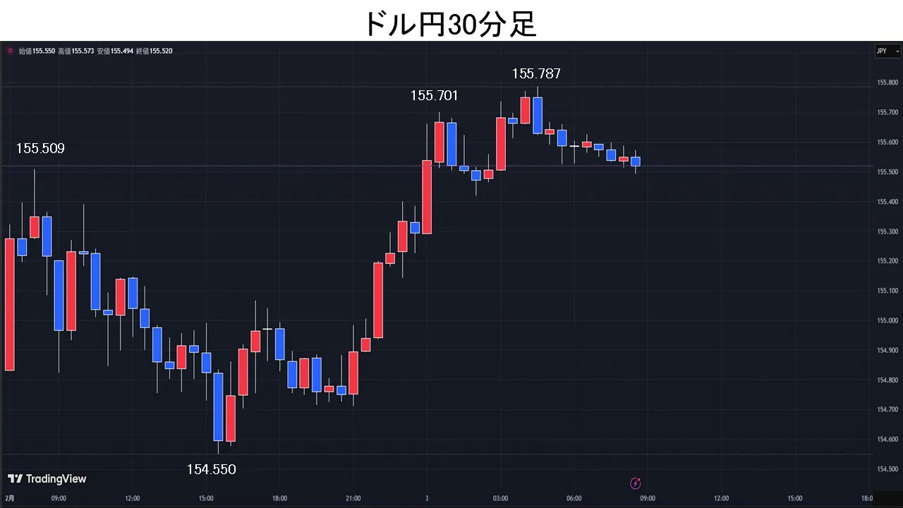 東京時間、ドル円は、週末までの衆院選世論調査で自民優勢と伝えられたほか、週末に高市首相が「足もとの円安基調で外国為替資金特別会計(外為特会)の運用が今ホクホク状態だ」と発言し、円安容認と捉えられたこともあり、買いが先行し155.50円まで上昇。その後、日経平均が下げに転じた事もあり、15時過ぎに154.55円まで失速。欧州時間、ドル円は154円台後半で揉み合い。NY時間、米10年債利回りが上昇に転じたことなどで円売り・ドル買いが先行。1月米ISM製造業景況指数が52.6と予想の48.5を上回ったことが分かるとドル買いが活発化し、ドル円は155.78円まで上昇。