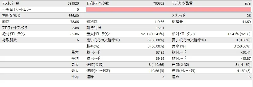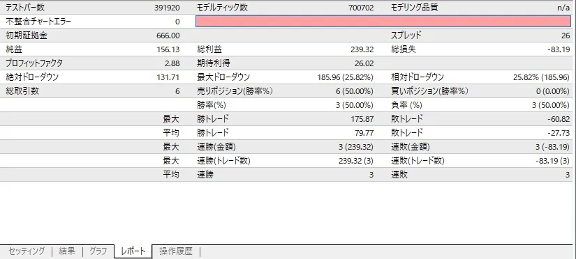 そこで、固定値の利確は外部パラメータにしてあるので、ここを 50 にして、ロットを 0.1 に抑えて、再度テストしてみました。