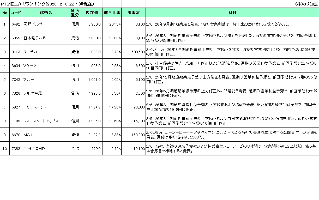 カブ知恵発 PTS値上がりTOP10(2026/02/06)