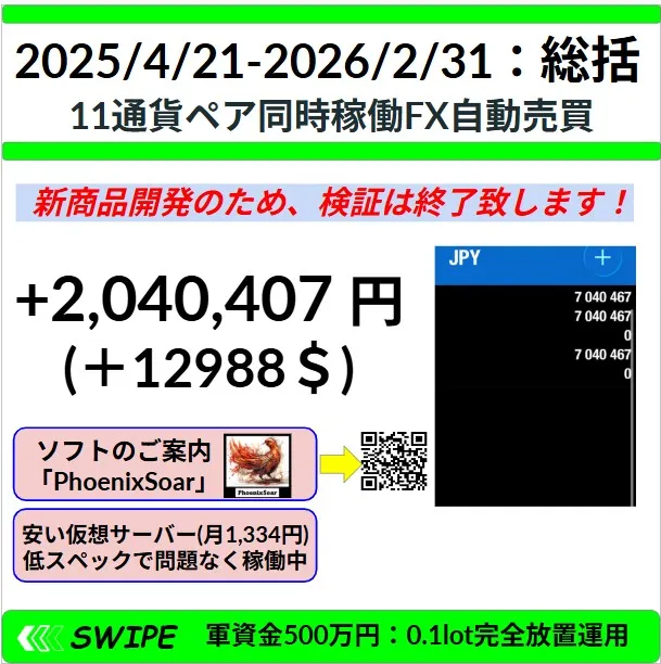 軍資金:500万円、レバレッジ 0.1Lot 設定 PhoenixSoarで使用可能な全11通貨ペア運用