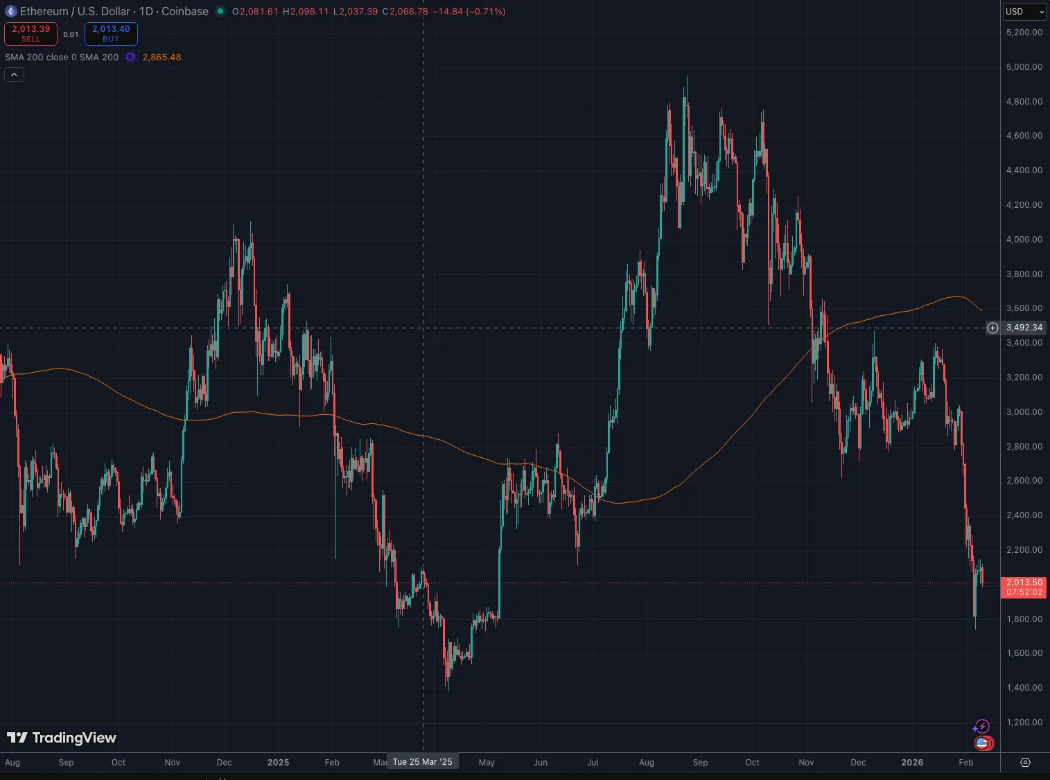 イーサリアム(ETH)も厳しい状況にあります。本日、過去24時間で3.8%下落し、2,000ドルをわずかに上回る水準で推移しています。