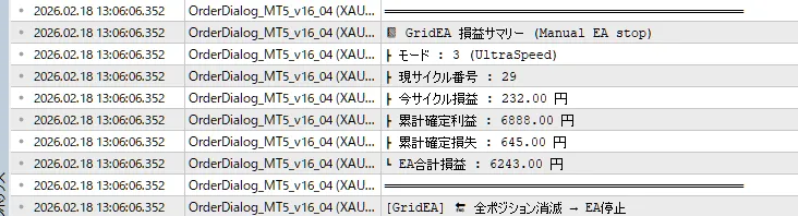 これは『想定損益額に基づいてEAを自動停止or手動停止させる』という、このEAの設計思想が活きた瞬間でもあります。
