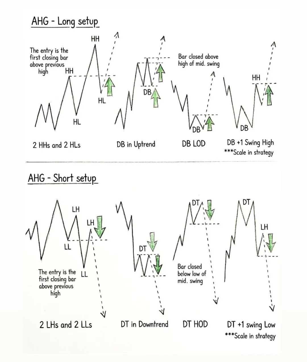 全設定に共通する重要なルール:エントリートリガーは常に同じです — 確認のために終値バーを待って前のスイングポイントのブレイクを確定させます。先を読まず、終値を待ちます。これらの設定は単純(トレンドの確認)からより高度(ダブルトップ/ボトム + スケールイン)へ進行し、市場の状況に応じてオプションを提供します。