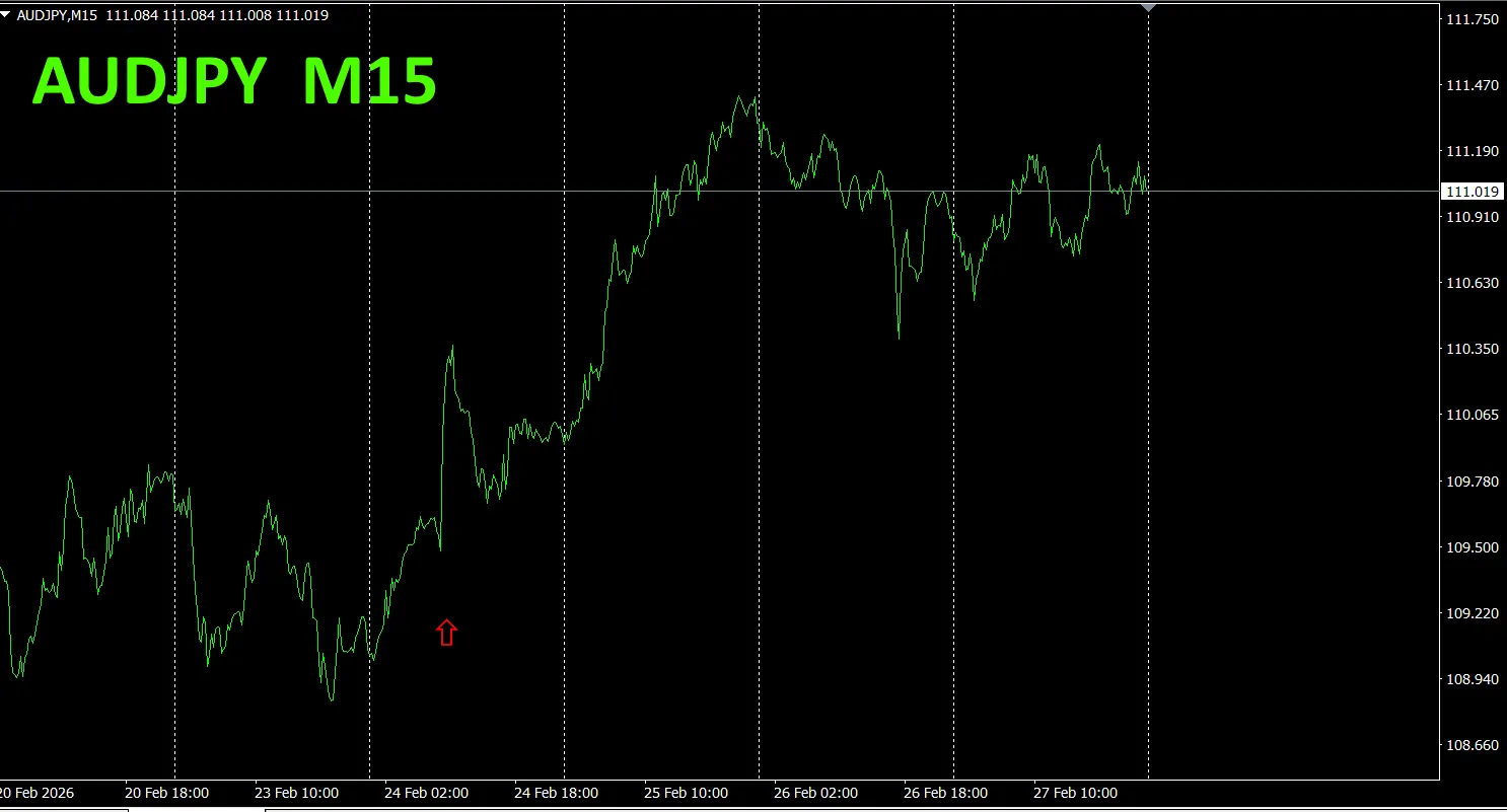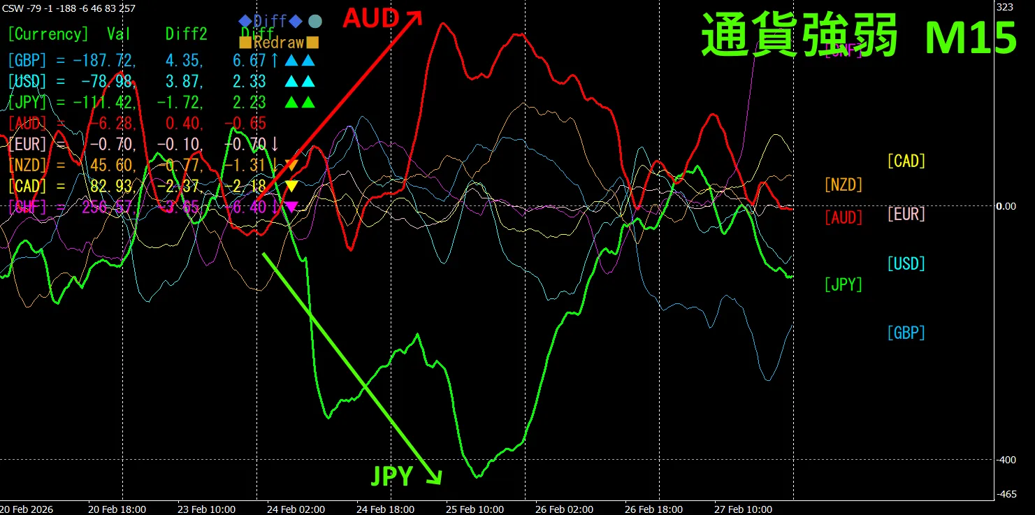 15分足の通貨強弱グラフを見ると、AUDが強く、JPYが弱くなっていて、通貨強弱グラフで、AUDとJPYが、見事な逆相関関係になっていることがわかります。