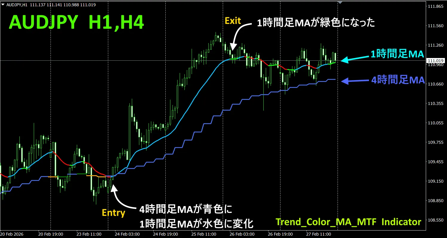 一例として、AUDJPYの1時間足チャートに、4時間足の移動平均線を同時に表示させてみました。ガタガタと階段状になっているのが、4時間足の移動平均線です。1時間足の移動平均線も、4時間足の移動平均線も、上昇時は青色系のカラーで、下降時は赤色系のカラーで表示されるので、カレントチャートのトレンド方向と、上位足のトレンド方向が、カラーで一目で判別できます。