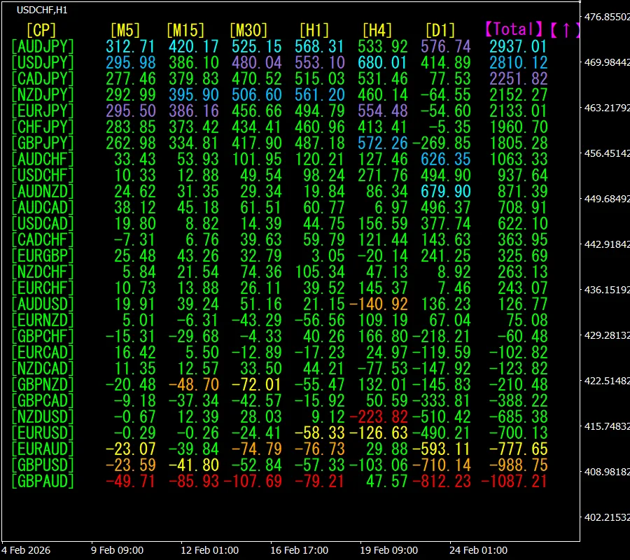 [Total]数値の降順に並んでいます。一番上にあるAUDJPYは、[H4]を除く全ての時間足で青色系の表示色になっています。Total数値が、2937.01で、プラスの数字になっています。AUDJPYに上昇トレンドが発生していることが示唆されます。