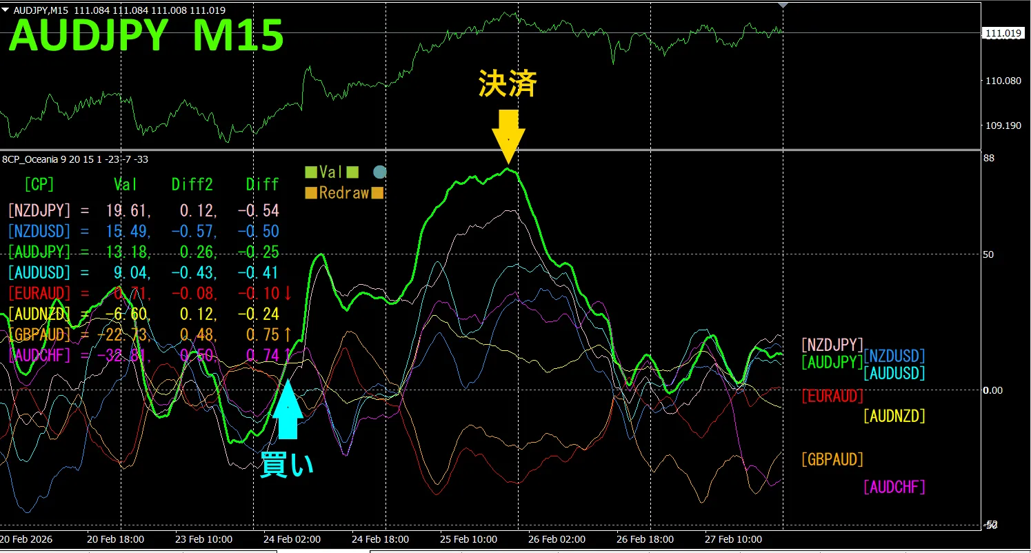 上半分は、AUDJPYの15分足チャートです。下半分は、「8CP見える化インジケータ」によるものです、緑色のグラフがAUDJPYに相当します