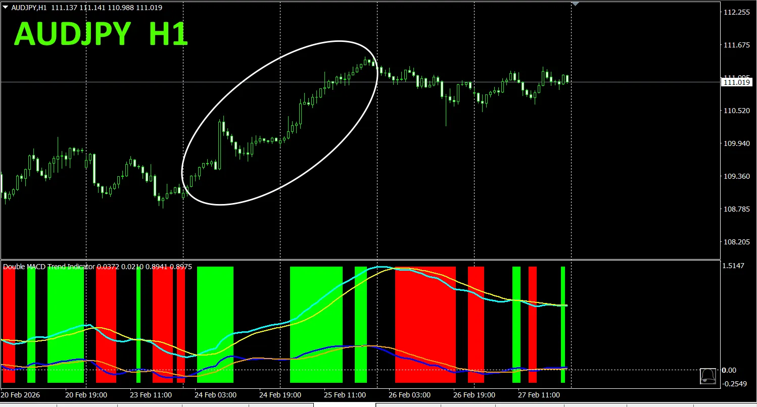 「Dual_MACD_Trend_Indicator」では、緑色のゾーンなら買い、赤色のゾーンなら売り、それ以外ではトレードしないという単純なルールに従うだけです。