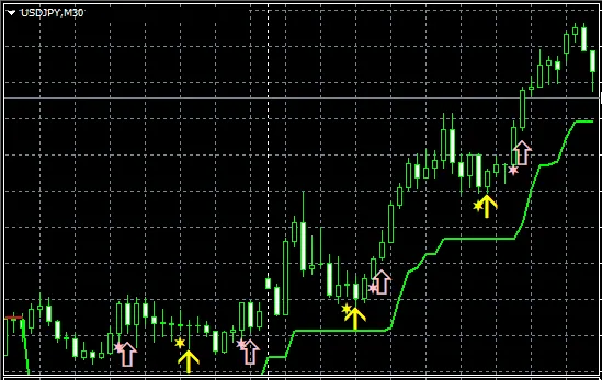 上のチャートでは、スーパートレンドのサポートラインの上でプライスは推移しており、【STRCI】のサインがタイミングよく点灯しています。