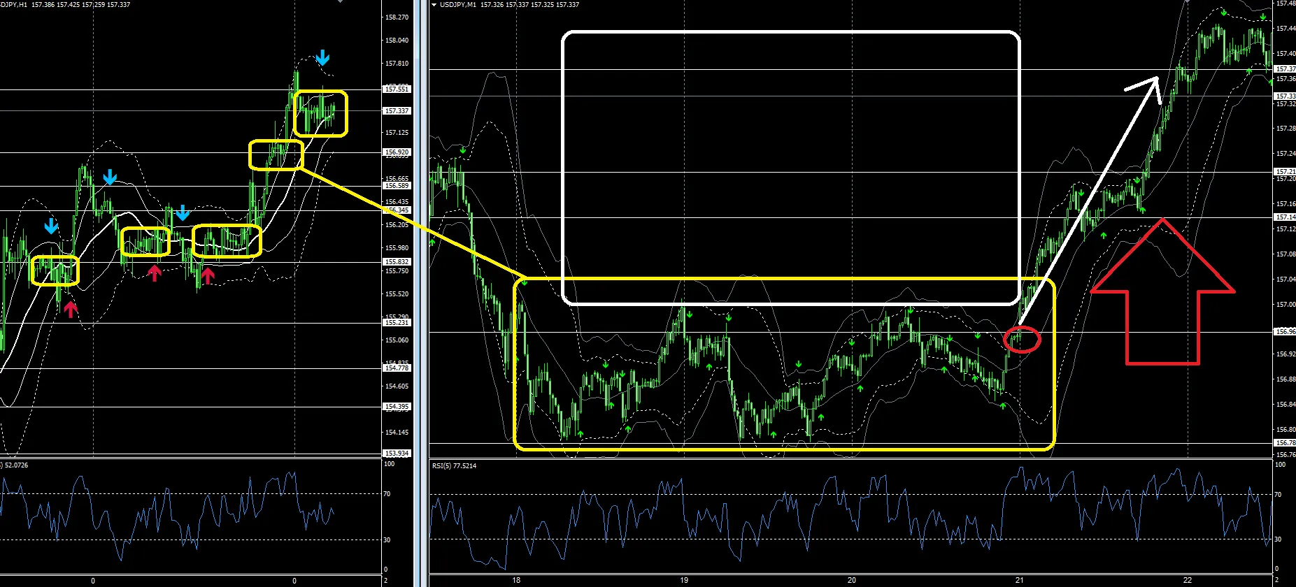 左1時間足の黄色□がレンジですが、今は一番右の□内でレンジ継続中という流れ。