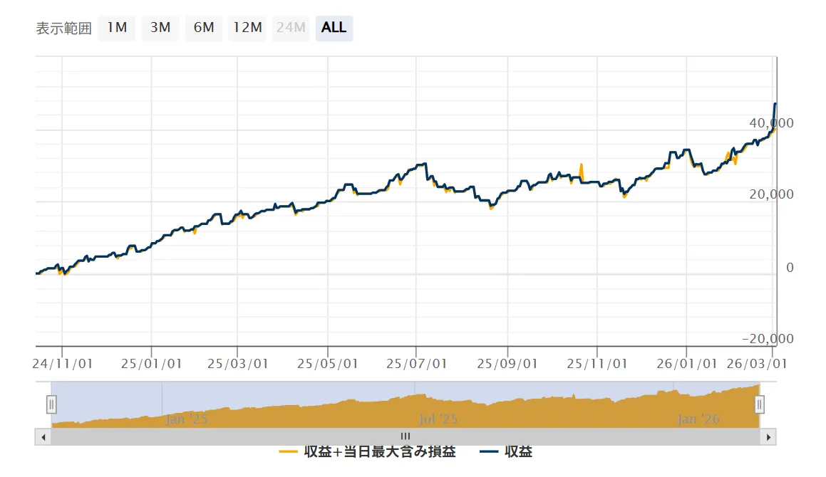 フォワードテストとライブシグナルの結果が非常に近い形で推移しています。