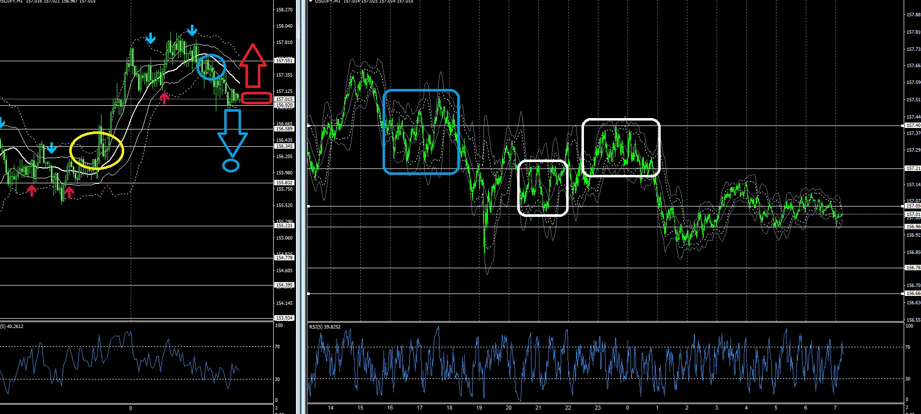 先程記事にした部分は、1分足チャートの青白〇のような場面です。