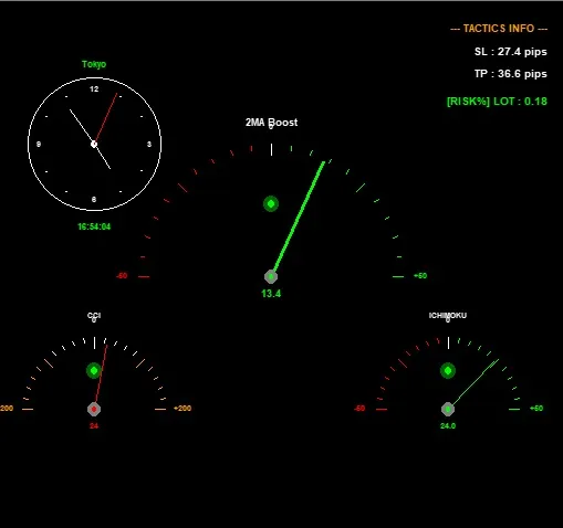 Mega Cockpitの最大の特徴は、MT4のチャート上に展開される美しい透過型ダッシュボードです。 2MAブースト計、RSI、MACD、一目均衡表、ボリンジャーバンド、ATR燃料計など、全14種類のインジケータからお好きな3つを選んで配置できます。