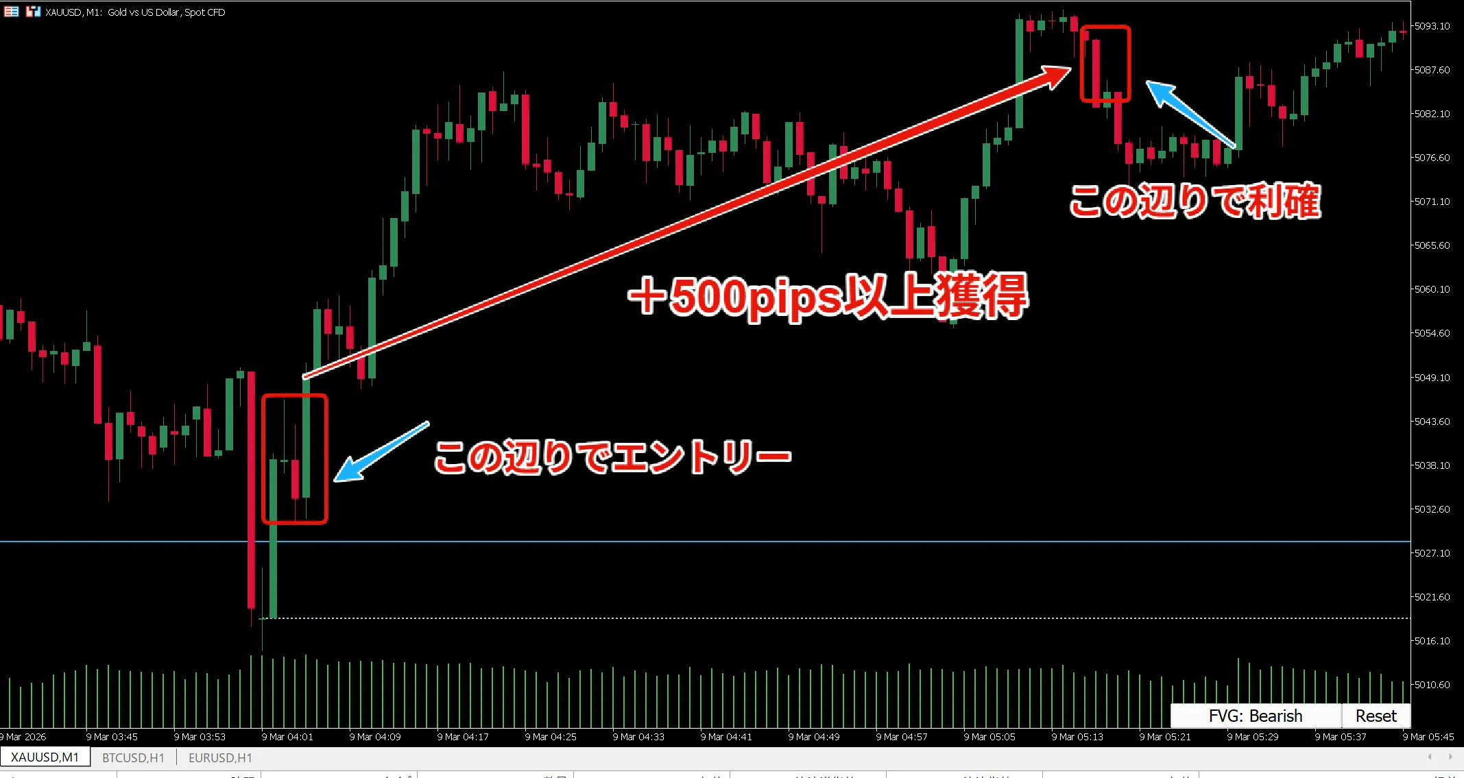 その後、1時間少しで一気に上昇トレンドを形成し、+500pips以上の爆益を安全に利確しました。