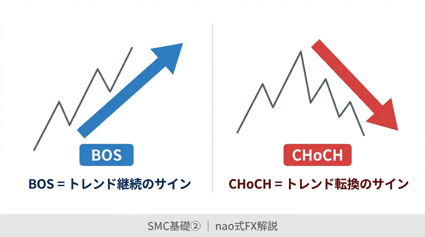 前回は「市場構造(HH・HL・LH・LL)」の読み方を解説しました。今回はその続きで、「BOS」と「CHoCH」という2つの概念を学びます。