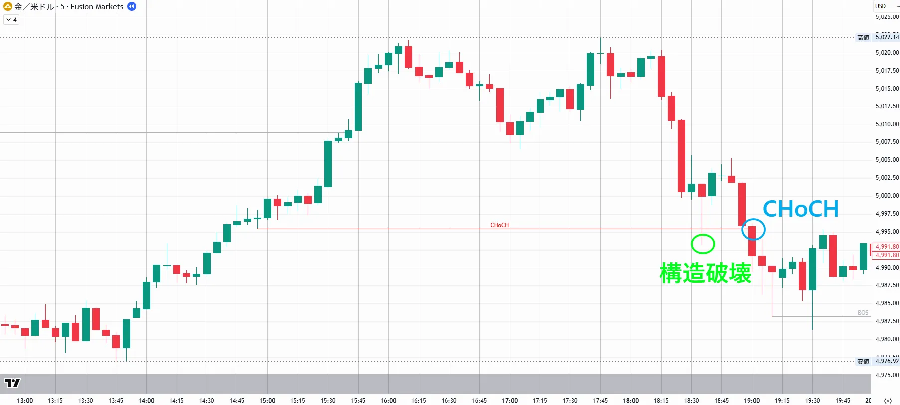 ①CHoCH発生(安値割れ)→「転換の可能性あり」と認識し、小ロットで早期エントリーを検討