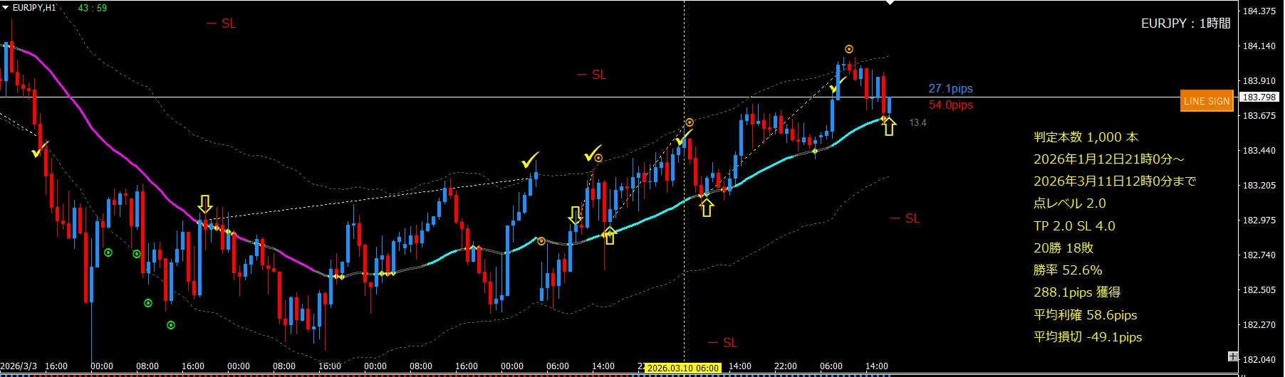 | 1000本 | ラインタッチエントリー(確定) | ヒストグラムDX2(4hours) | バンドタッチ(2.0) | ABUATR (4.0) |