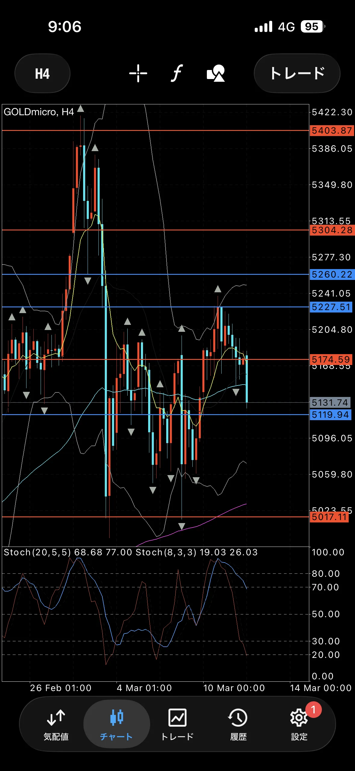 三尊右肩から5227の陰線を越えられないまま2本目の陰線アウトサイド