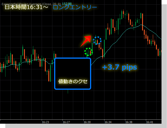 あとは、そのポイントでの利益の取り方の違いであって、細かくエントリー・エグジットを繰り返す「秒スキャ」であれば必然的にトレード回数が多くなり、1トレードで波全体を取っていく当該トレード手法のような「分スキャ」であれば、必然的にトレード回数は少なくなります。