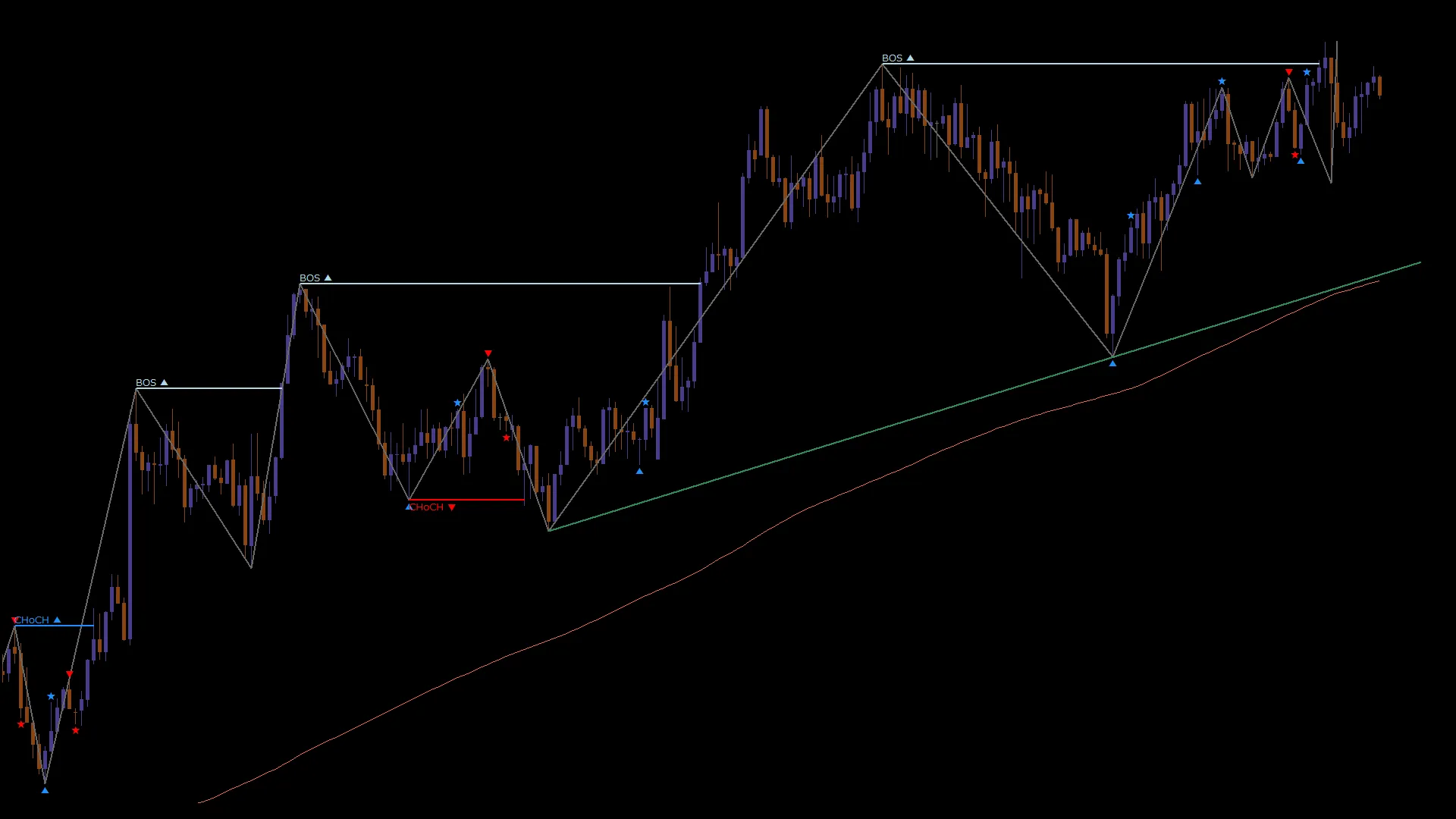 CHoCH / BOS を表示し、相場のトレンド構造を確認します。