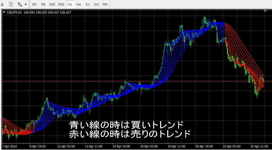 青い線の時は買いトレンド 赤い線の時は売りのトレンド になります。